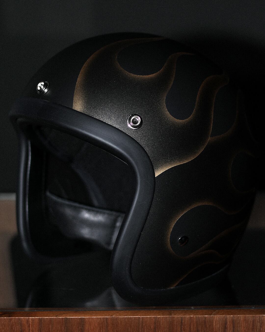 今回はマッドブラックの帽体に、Brass(真鍮)のようなフレイムスを三層にて描いています。