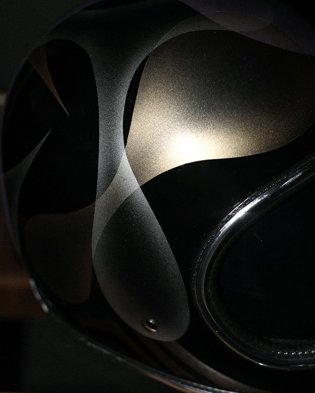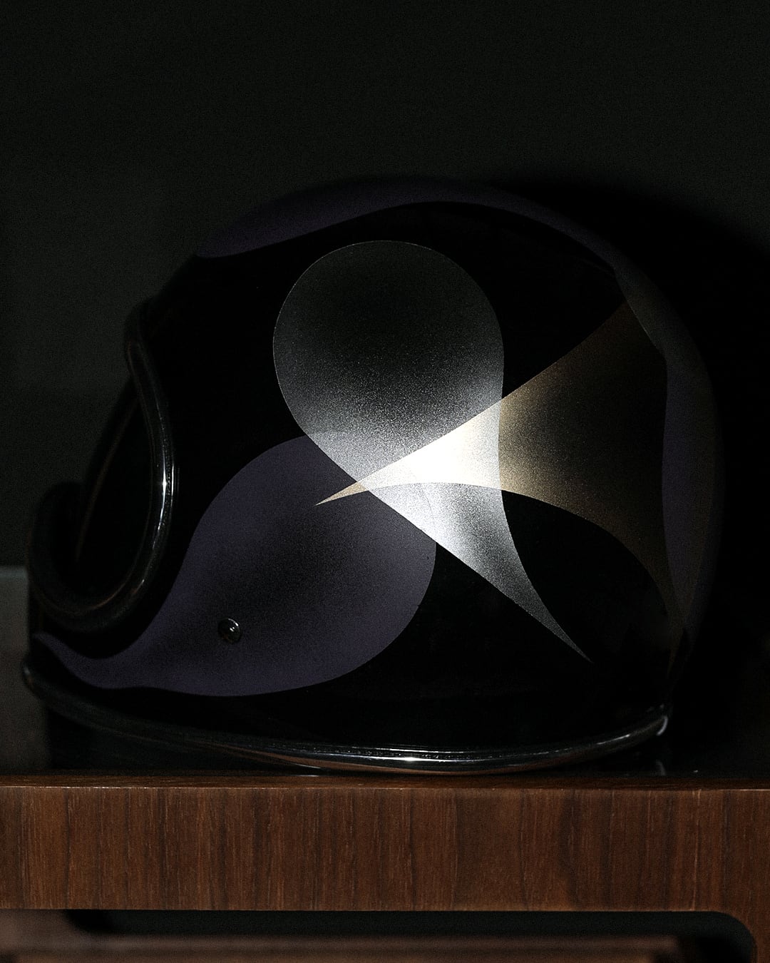 夜に街中を走っていると、ビルの光やお店のネオン、信号など様々な光が艶あり帽体には反射して映り込む様を一点物として表現しています。