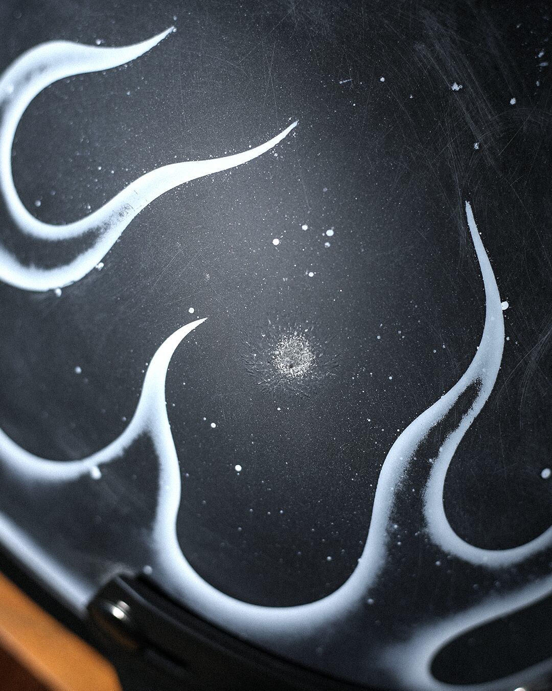 新品の帽体へフレイムスを描いた後、錆汚れや落下傷、艶引けなど様々なダメージを職人が丁寧に描き、まるで当時物のように仕上げました。