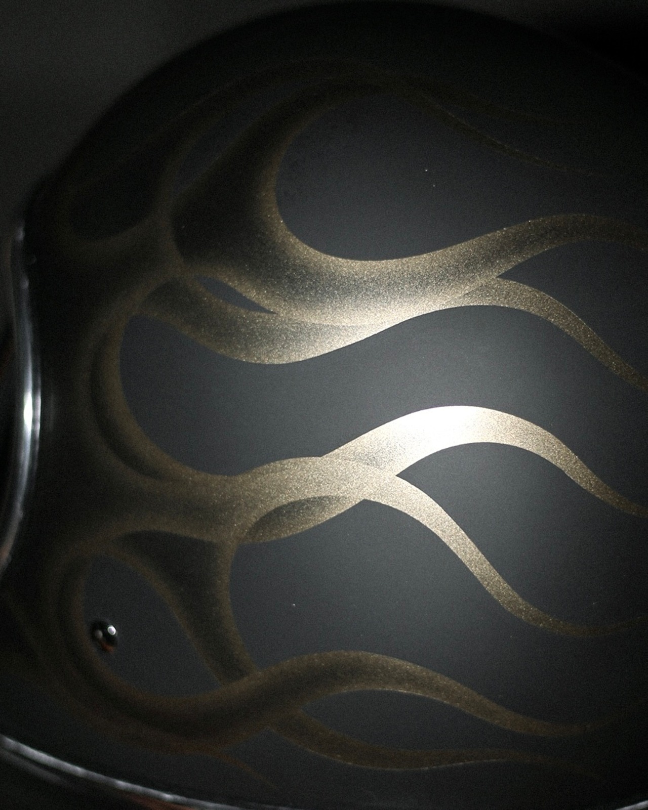 背面まで侵食していく様にフレイムスを描き、フレイムスそれぞれに陰影をつけることで、様々な角度から楽しめる一点物となっています。
