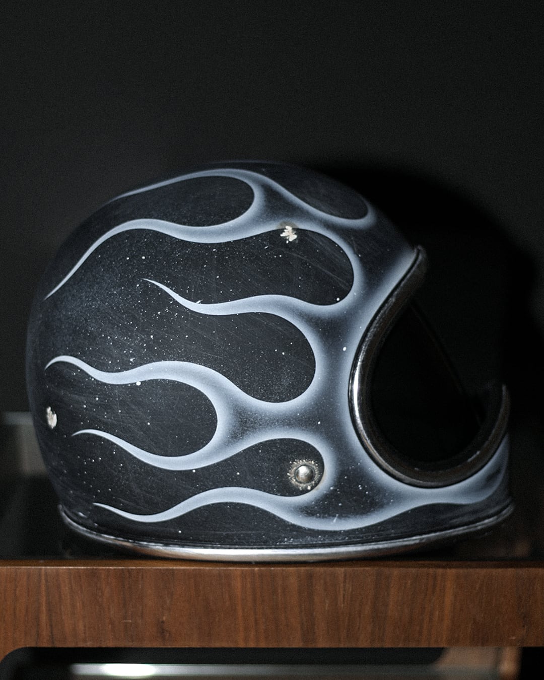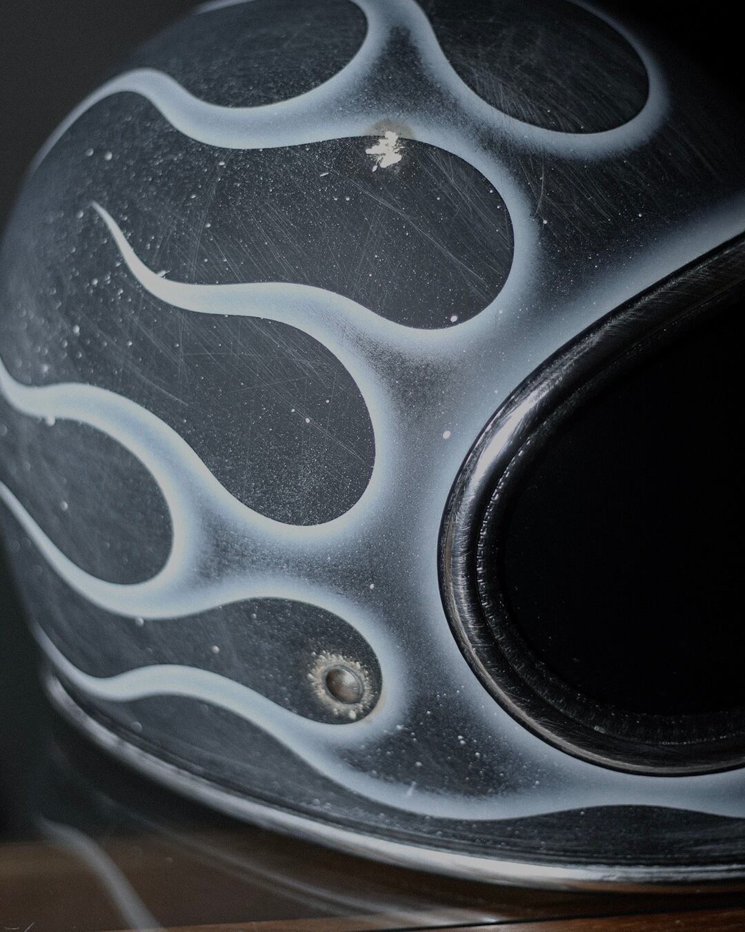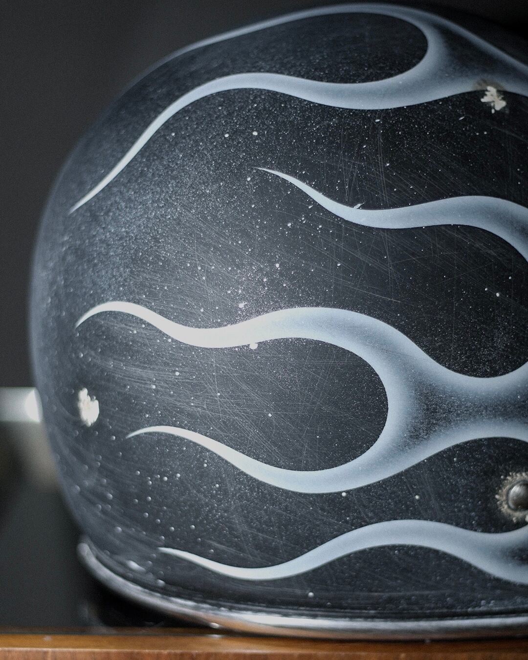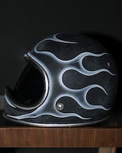 今回はマッドブラックの帽体に、フルでフレイムスを描き全体へエイジングを描いた一点物となります。