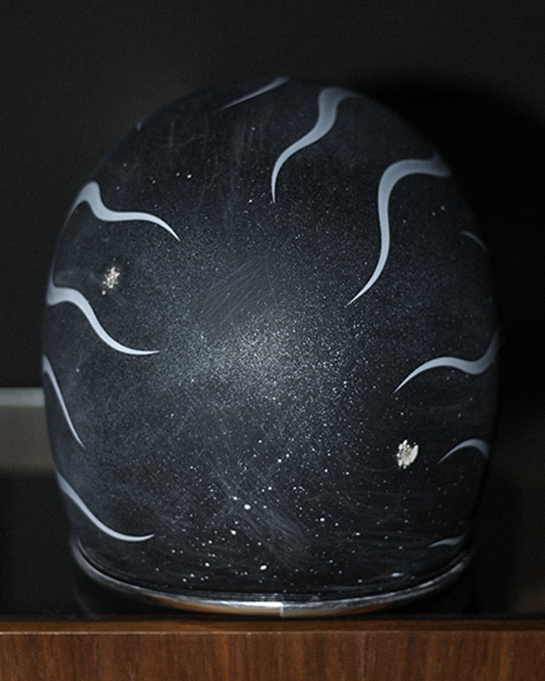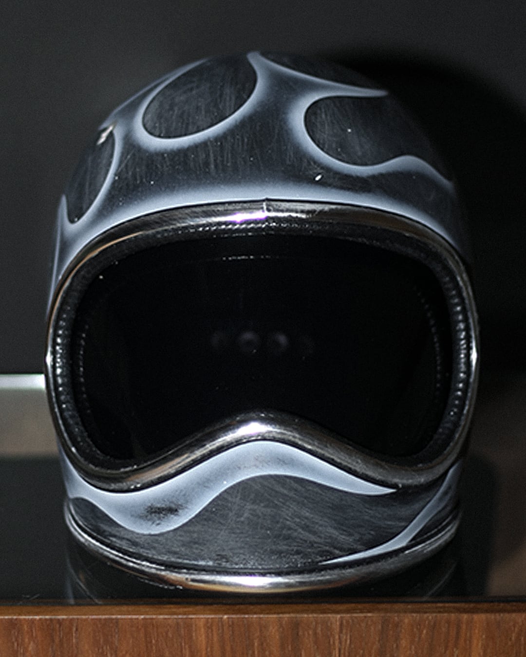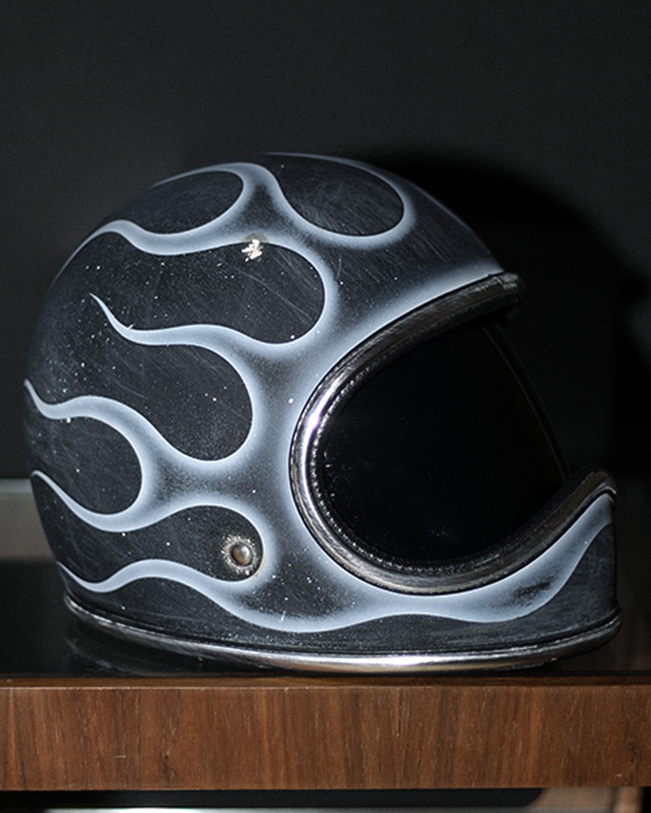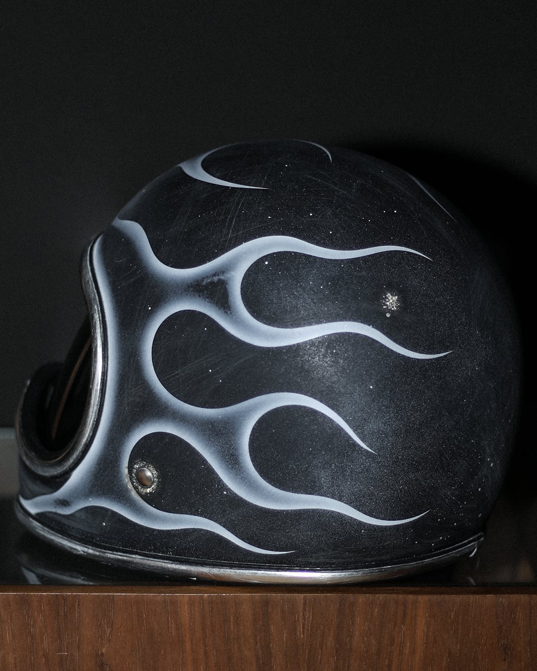 今回はマッドブラックの帽体に、フルでフレイムスを描き全体へエイジングを描いた一点物となります。