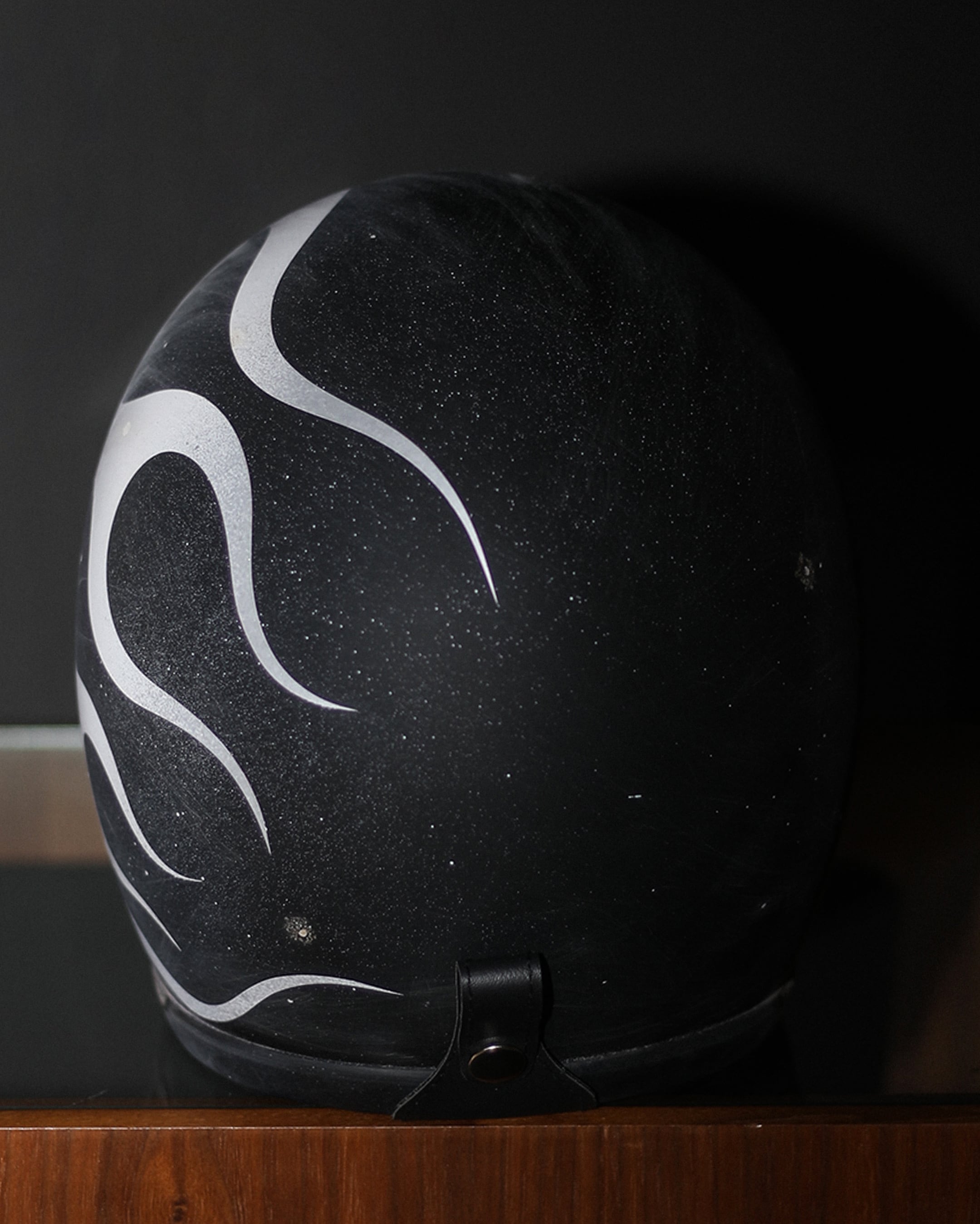 マッドブラックの帽体へ、雲をイメージした艶のない白色フレイムスを描きエイジング加工を施しています。