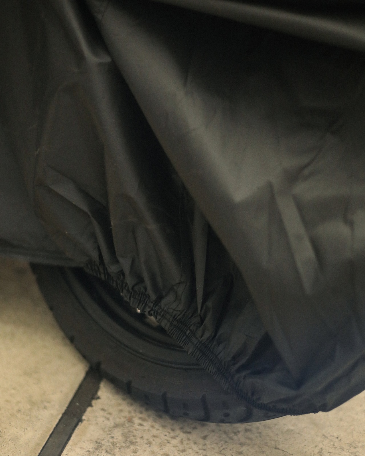 裾部分に伸縮ゴムを採用し、バイク両輪にピタッと密着。砂やホコリの侵入も防ぎます。
