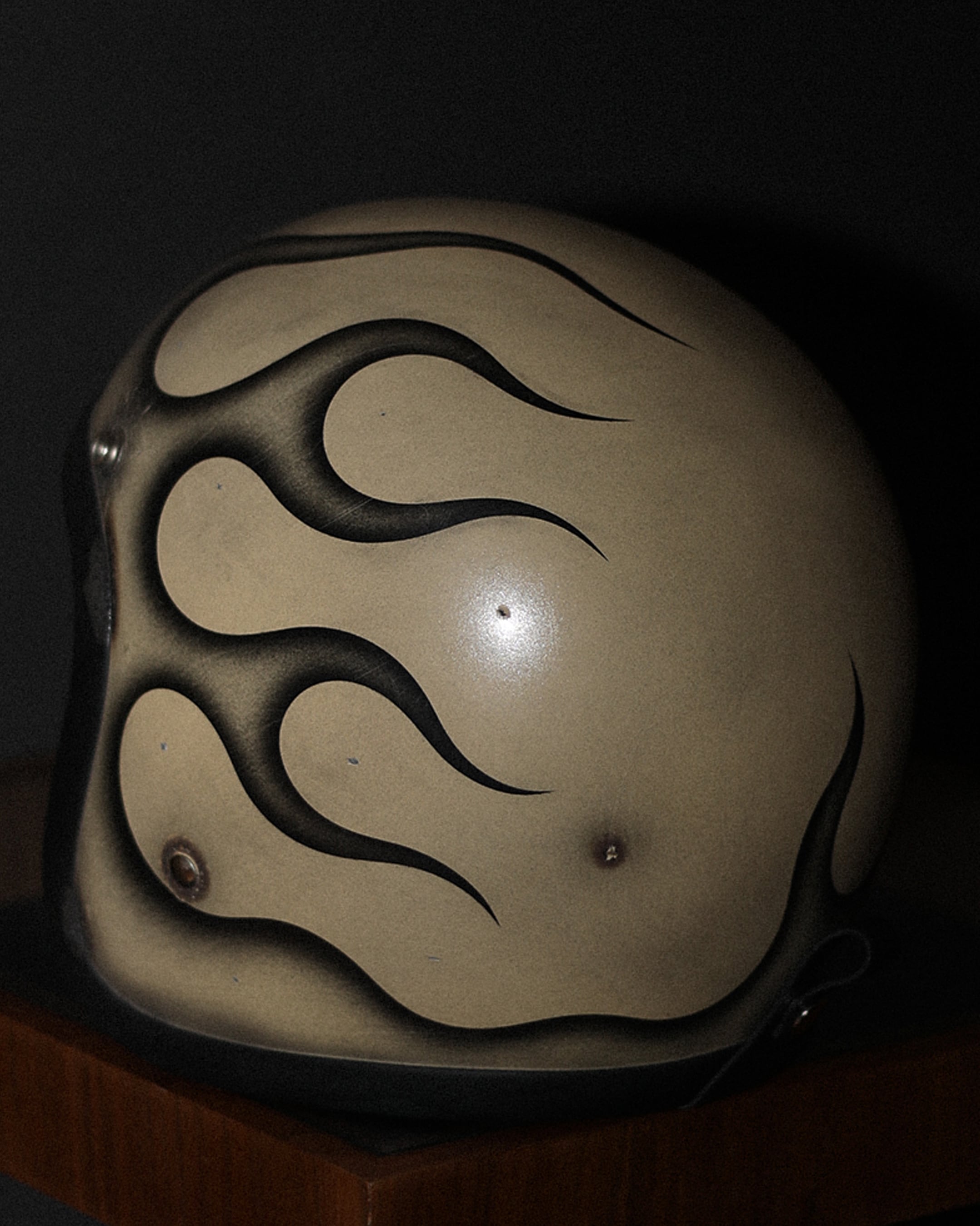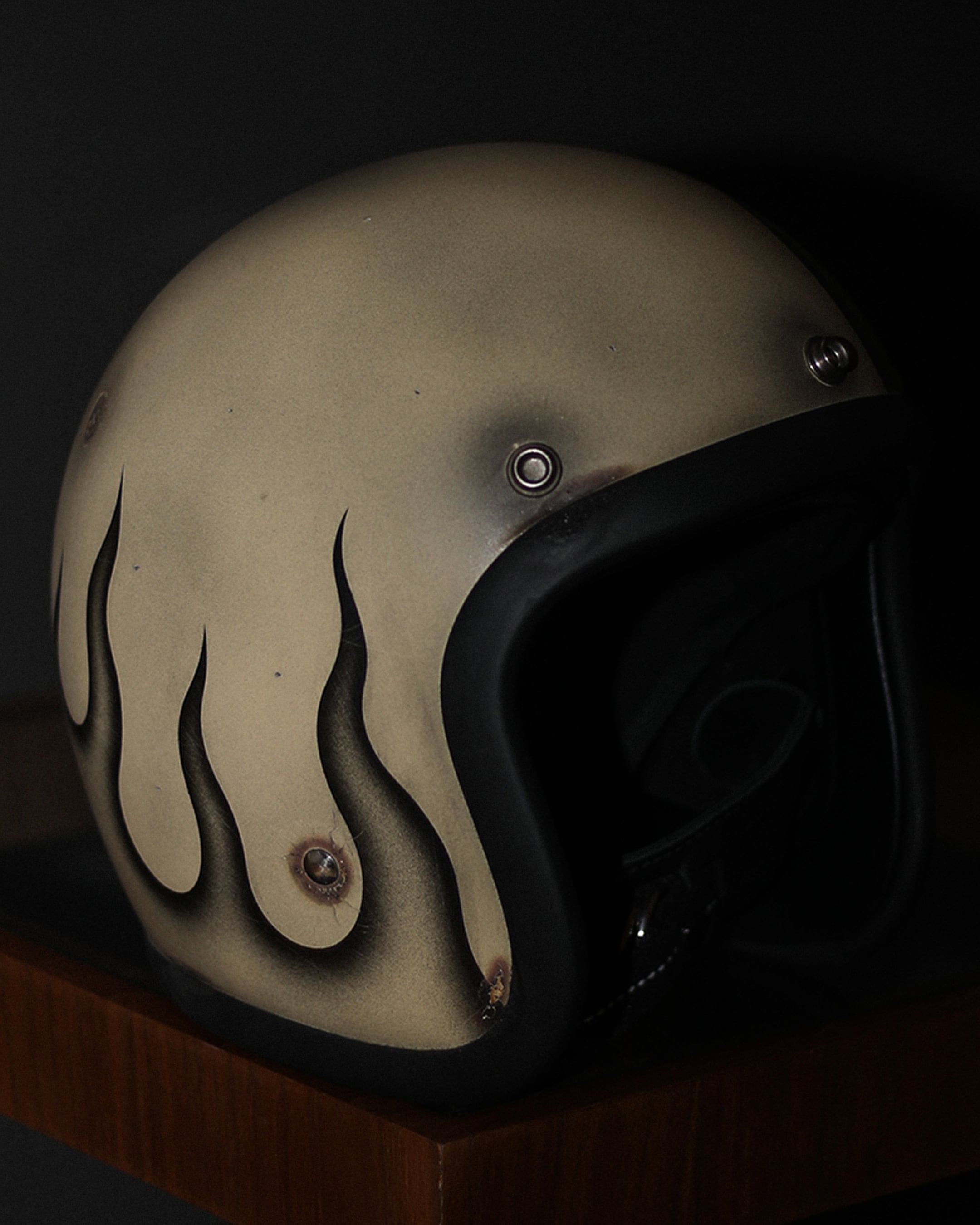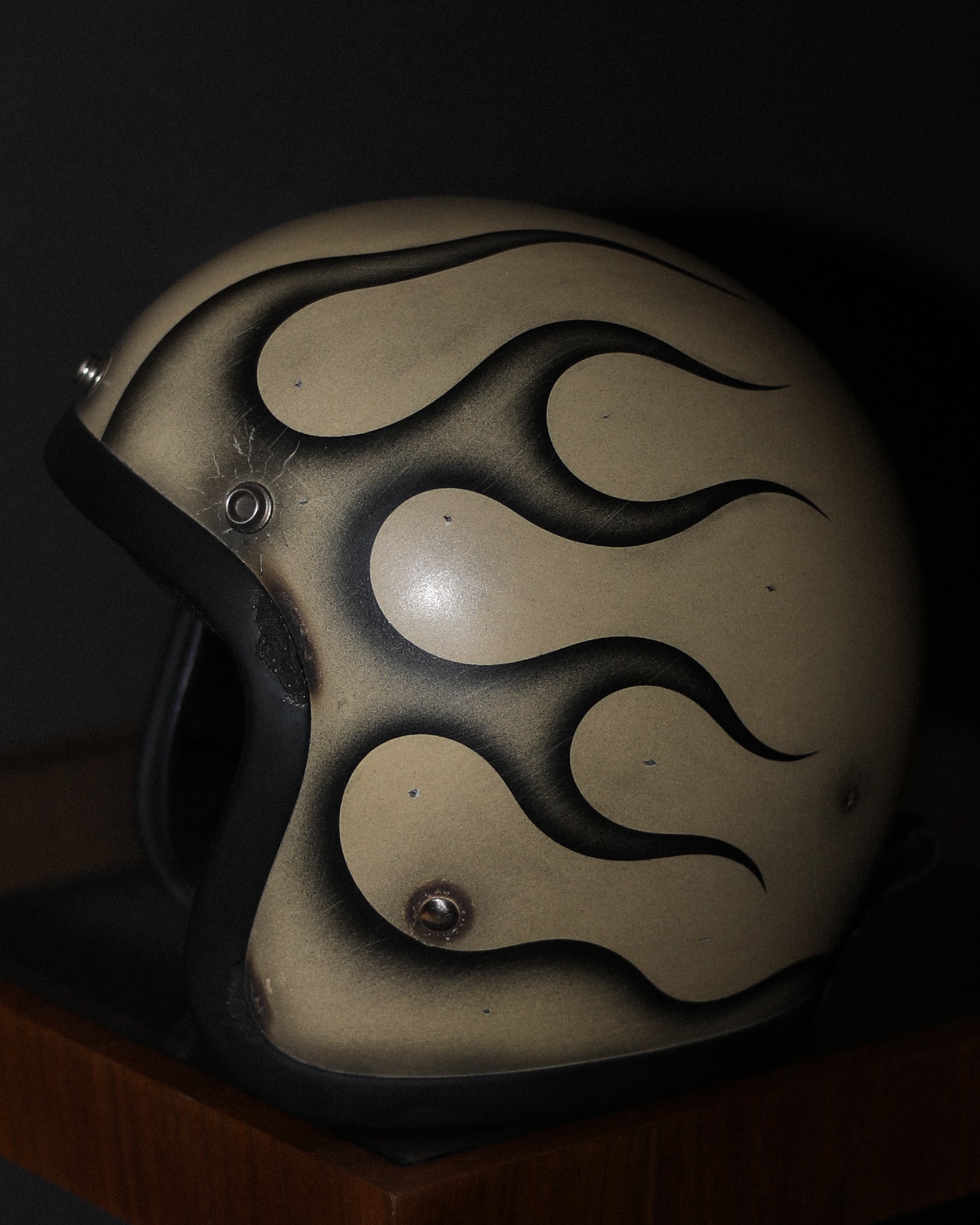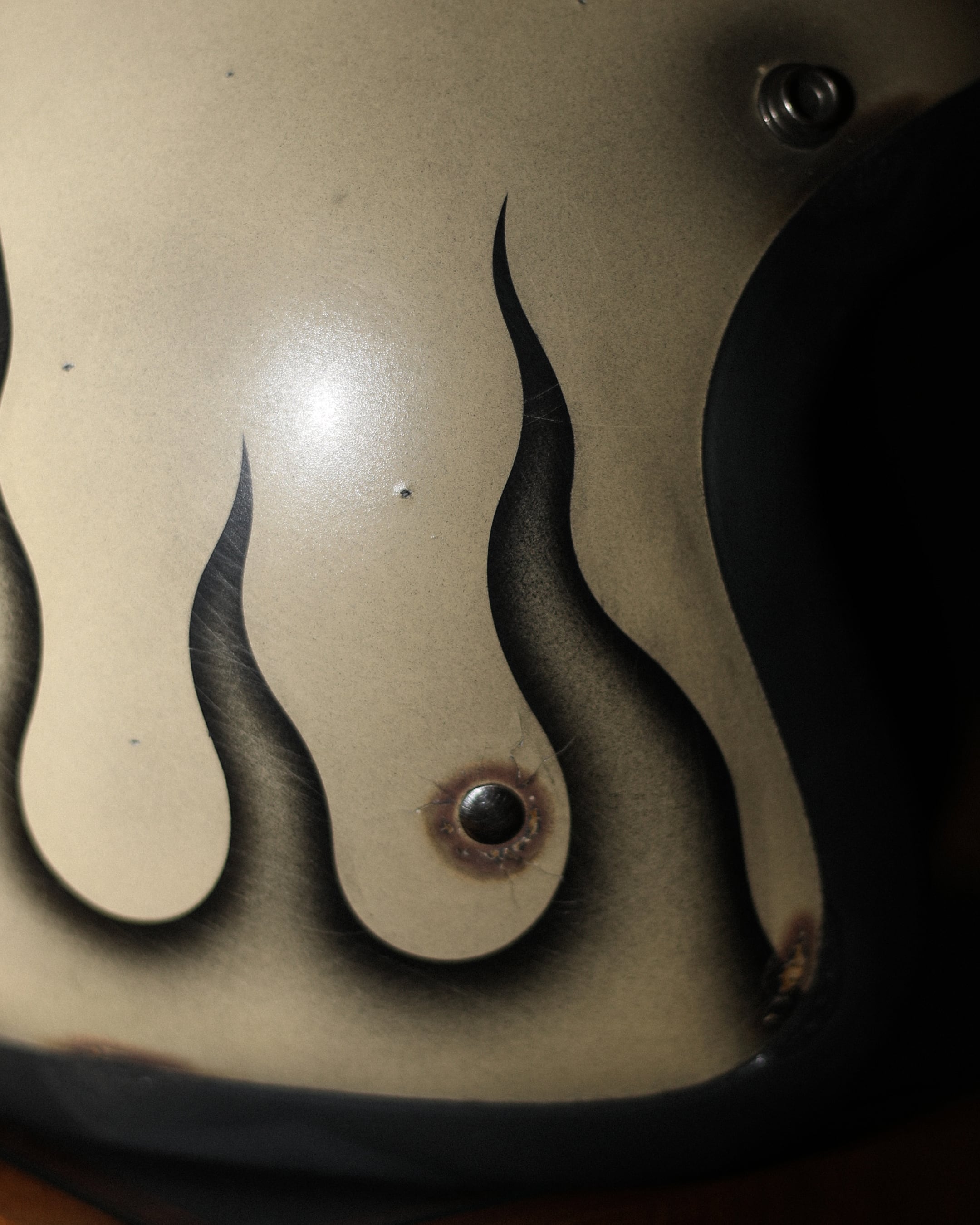 今回はベージュにて全体を塗装後、本格エイジング加工×非対称フレイムスを施した一点物になります。