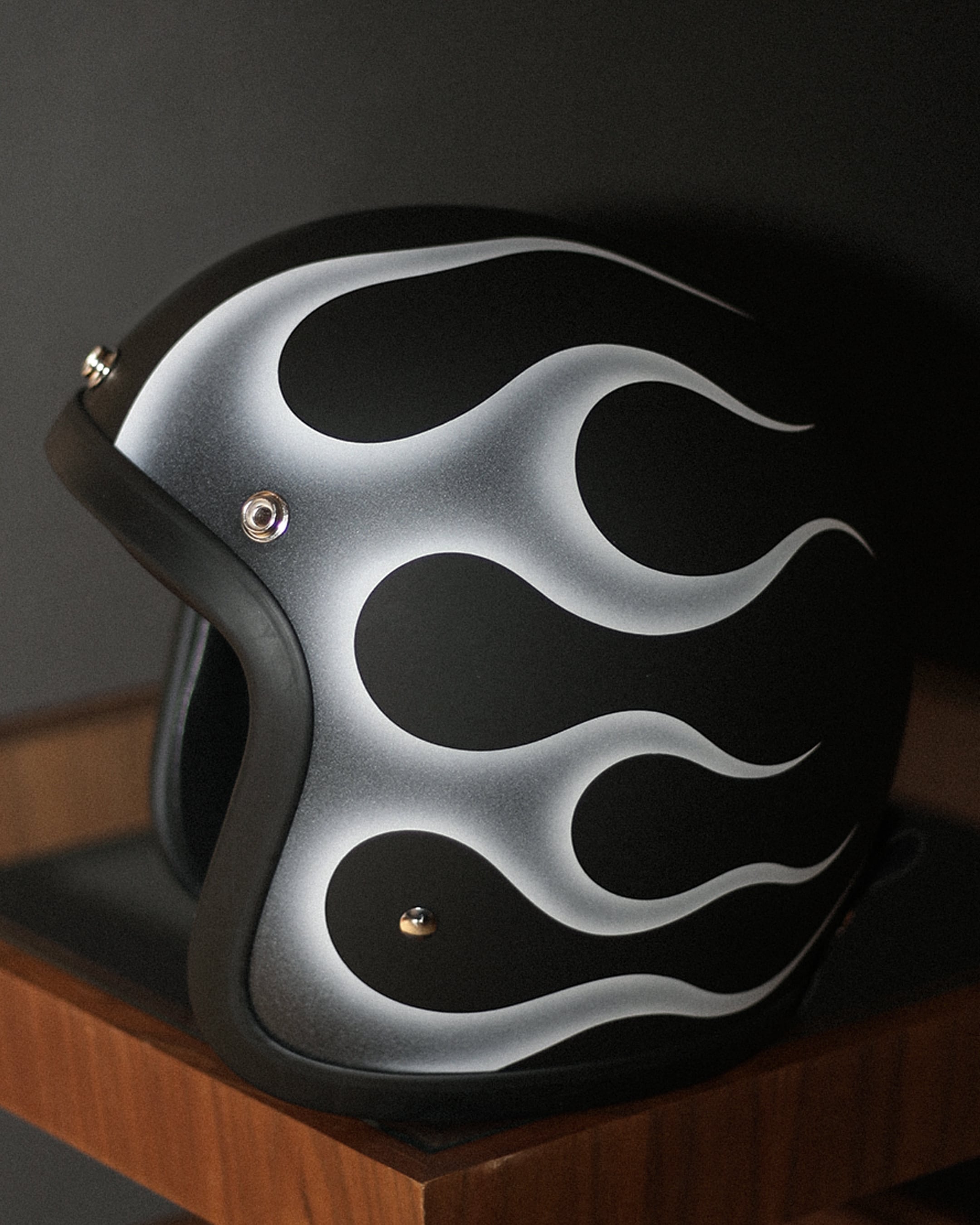 左側と右側で印象が大きく異なるように、左側は艶なしの帽体に艶ありブラック塗料にてペイント、右側はコントラストの強いホワイト塗料にて描いています。