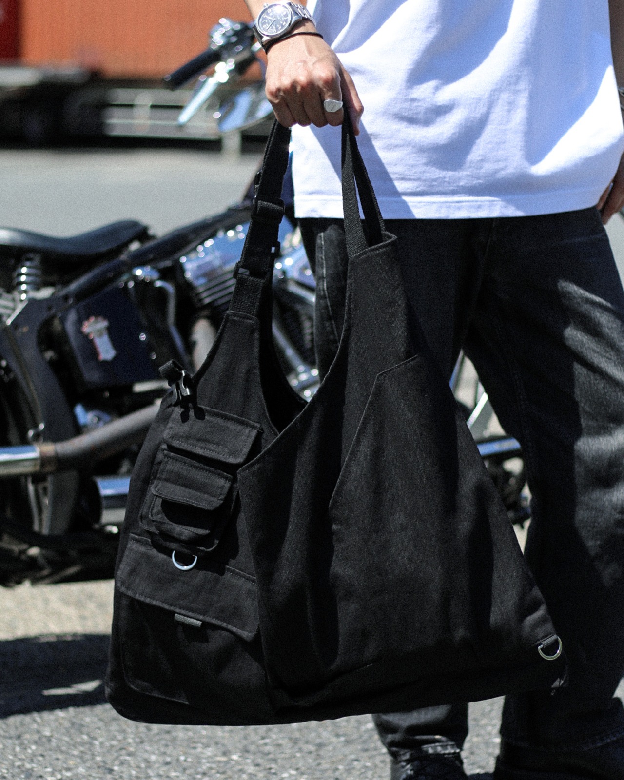 This is a 2-way fishing vest that can be used both as a vest and a shoulder bag (handbag) by attaching the strap at the bottom. You can wear it as a vest, and it provides enough space to store large items like a helmet.