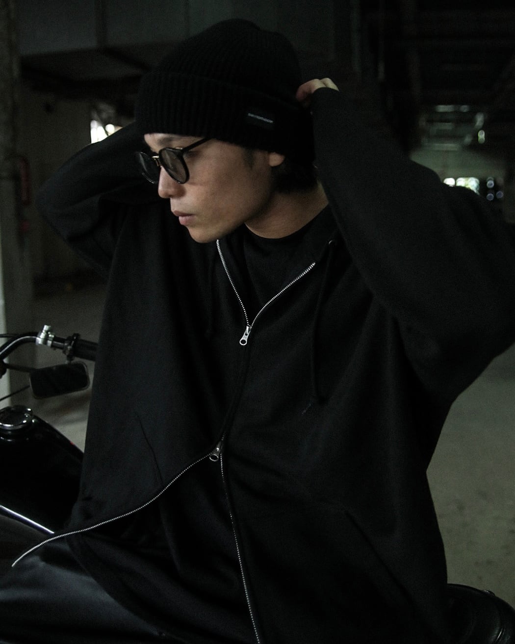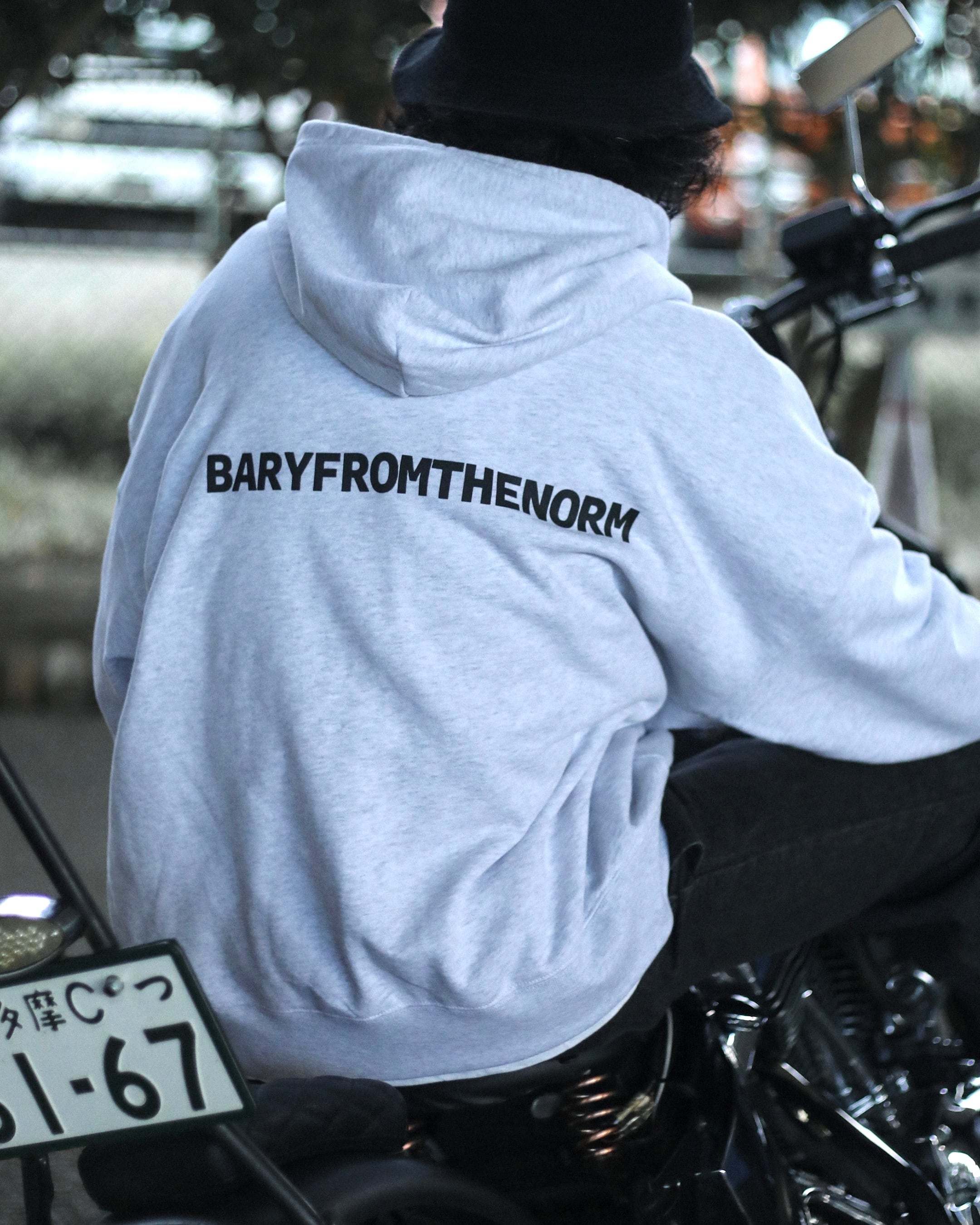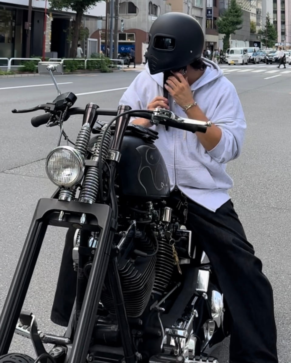 バイクに座った際はジップ部分を調整していただくことで、モコっとならずに着用することができます。