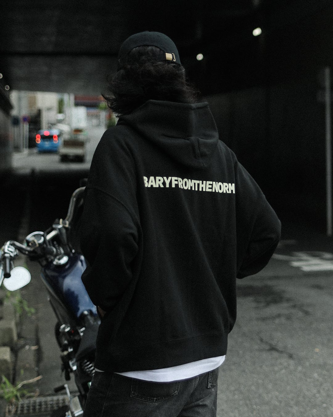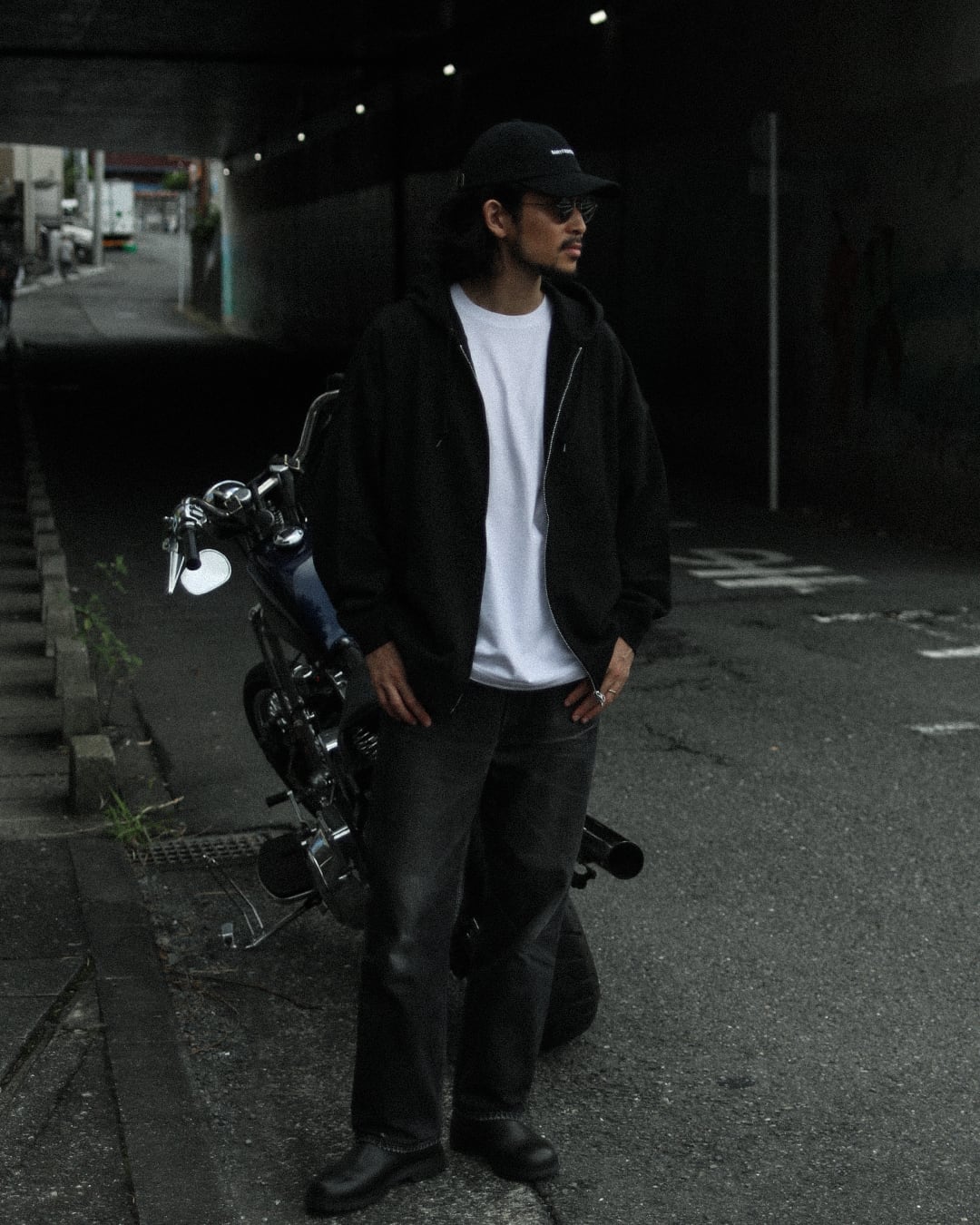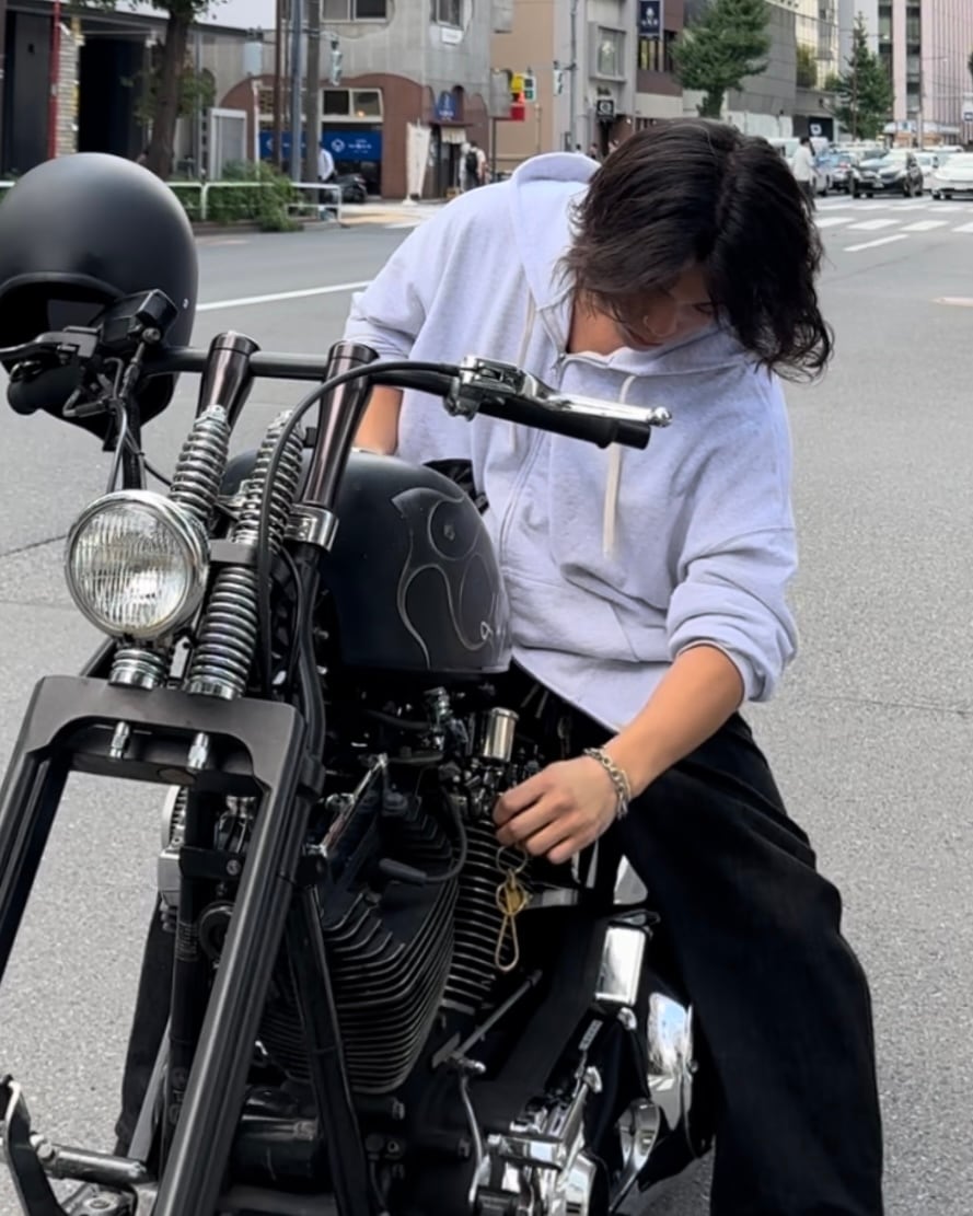バイクに座った際はジップ部分を調整していただくことで、モコっとならずに着用することができます。