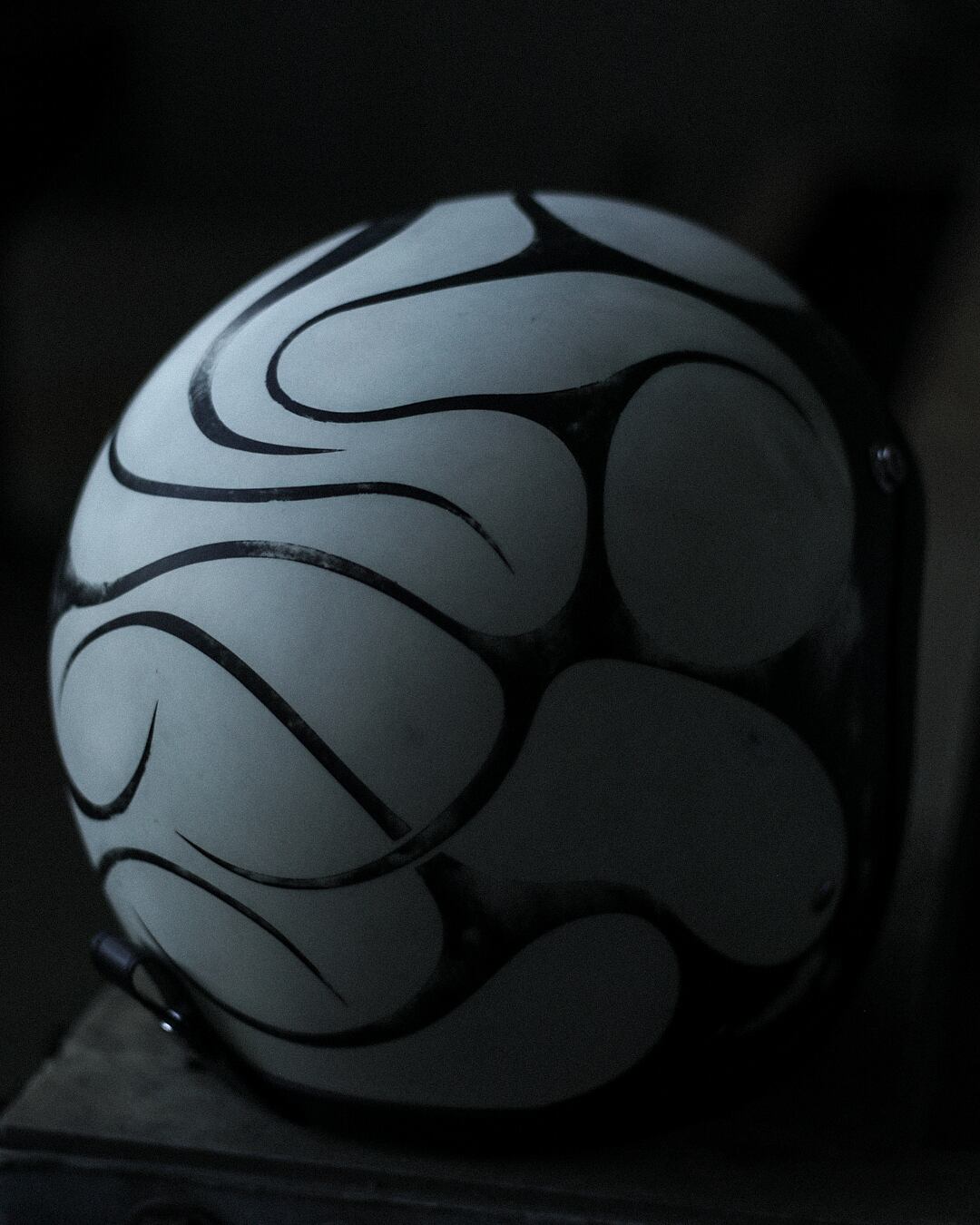 帽体へ流れ交差するオリジナルのフレイムスを描きペイントした後、全体をまばらに研磨しヴィンテージ感を出しています。