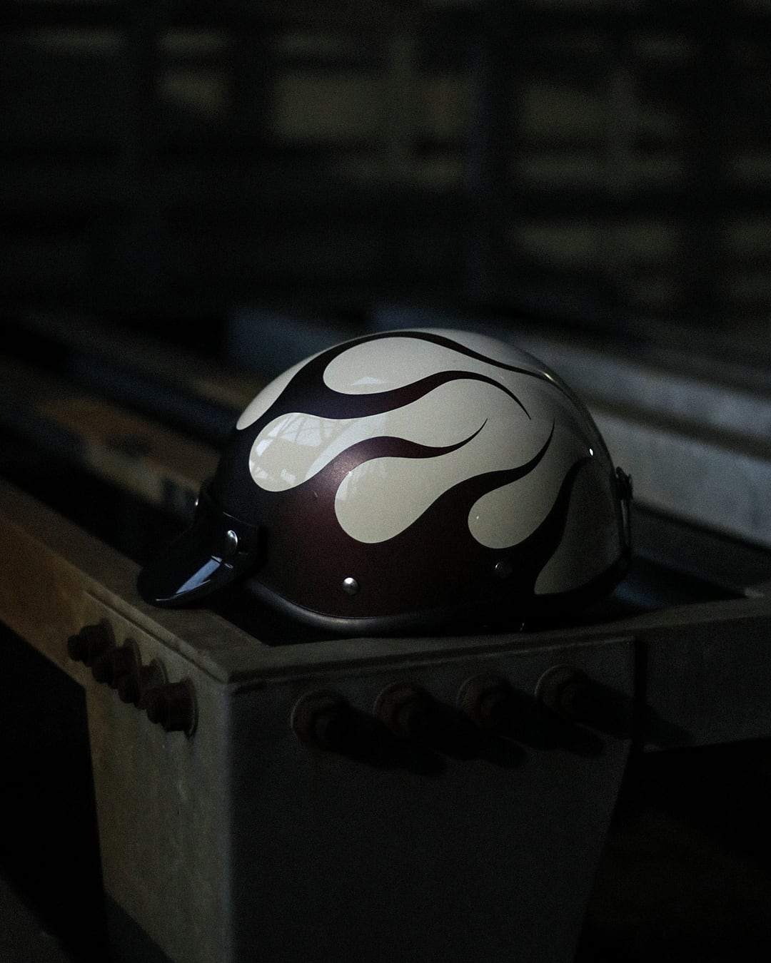今回はベーシックとなりつつあるフレイムスをハーフヘルメット用にオリジナルでデザインし、赤と黒のグラデーションで仕立てています。